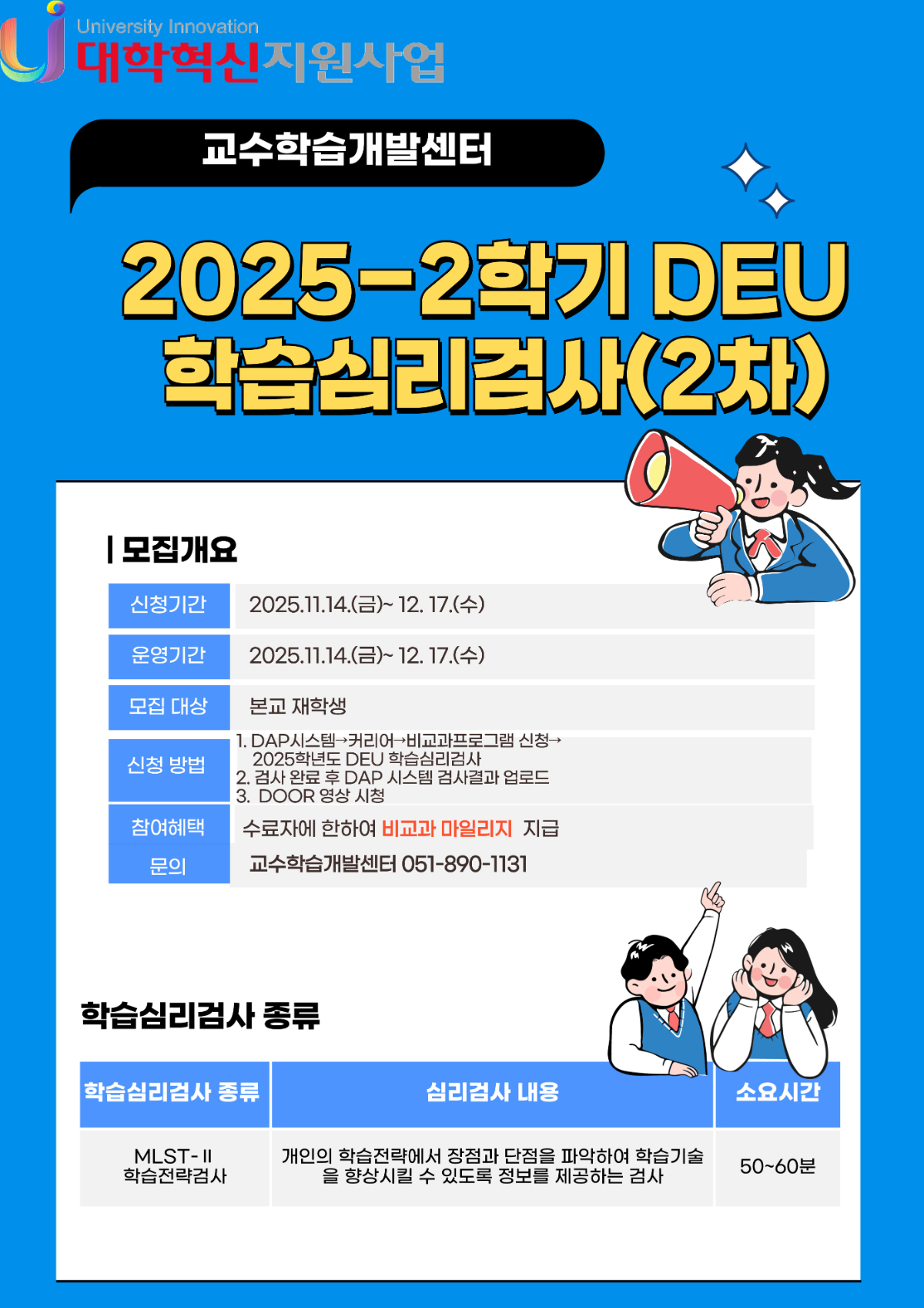 교수학습개발센터의 학습지원 프그램인 2025-2학기 DEU 학습심리검사(2차)를 다음과 같이 안내 하오니 많은 신청 바랍니다.